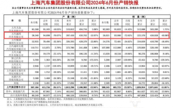 上汽集团2024年6月份产销快报显示,该月上汽通用的销量为26021辆,同比暴跌72.02%;今年1-6月份,上汽通用累计销量为225579辆,同比下降49.98%。