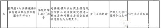 追溯董辉炯的过往可以发现,在2021年8月13日,福州农商行因14项违法行为被处罚658万元。时任行长董辉炯对福州农商行未按规定报送大额交易和可疑交易报告的违法违规行为负有责任,被处3万元罚款。