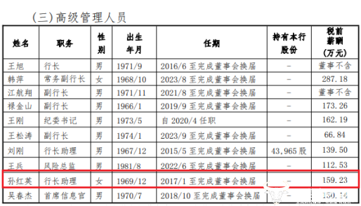 据大连银行2023年报可知,孙红英的薪酬为159.23万。大连银行有两位行长助理,另一位行长助理刘刚的薪酬为139.5万,二人薪酬相差近20万。