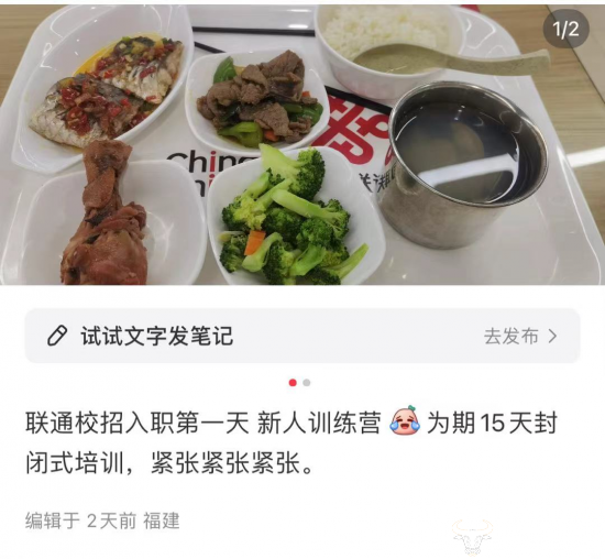 不过,从网友晒出的图片来看,入职的紧张情绪丝毫不影响网友“干饭”。网友所在的联通公司饭菜非常丰盛,有鱼有肉还有大鸡腿,此外荤素搭配均匀,还有一碗汤。虽然没有牛奶和水果,不过这些也足够人吃好吃饱了。