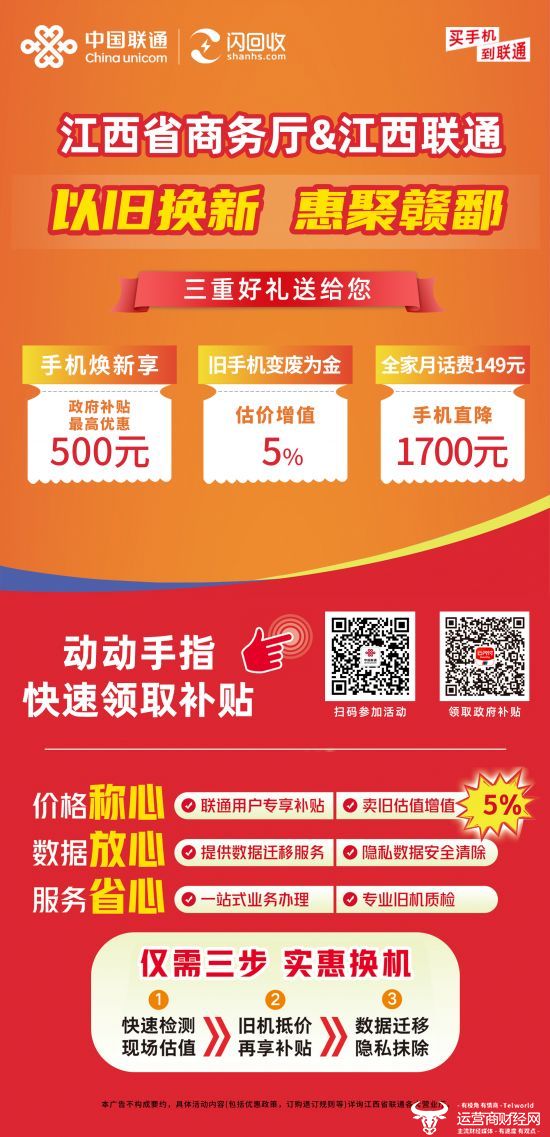 此次江西联通“以旧换新 惠聚赣鄱”促销活动将持续至10月底,通过活动不仅向广大用户普及绿色消费理念,同时还激发市场活力、拉动内需增长、推动江西省经济社会的可持续发展。接下来,江西联通将持续秉承“客户为本、服务至上”的核心理念,不断创新服务模式、提升服务质量、拓宽服务领域,充分发挥企业责任与能动性,为赣鄱广大用户提供多样化、个性化业务,以更加优质的产品和服务,满足以旧换新消费需求,进一步推动绿色低碳发展,为构建数字江西贡献联通力量。