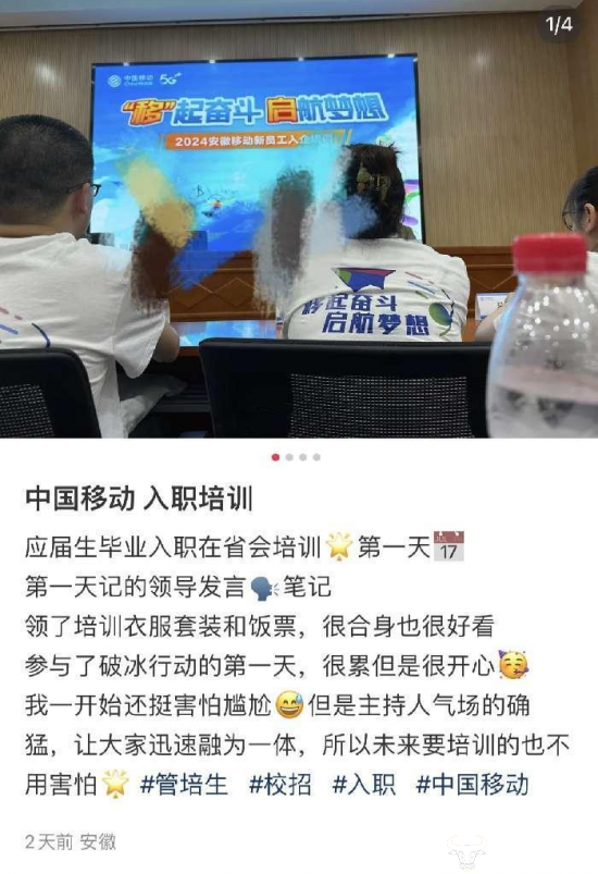 随着高考结束,越来越多应届毕业生流入就业市场,运营商行业也开始了对应届毕业生的入职培训。近日,一个IP定位在安徽阜阳的网友在社交平台分享了自己在安徽移动的入职培训经历,本次运营商财经网就带大家一起了解一下安徽移动入职培训都有哪些福利呢?