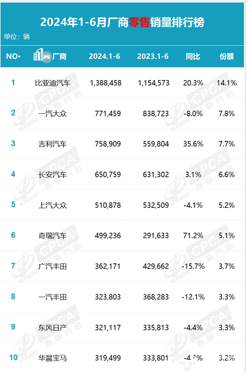 2023年上半年,厂商零售销量排行榜第三名是长安汽车,销量为631302台;而2024年上半年,长安汽车虽然同比销量有所提高,但榜单排名却下降到第四位,销量为650759台,同比提高3.1%.