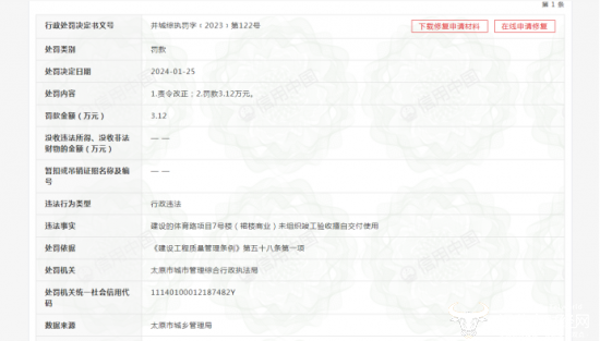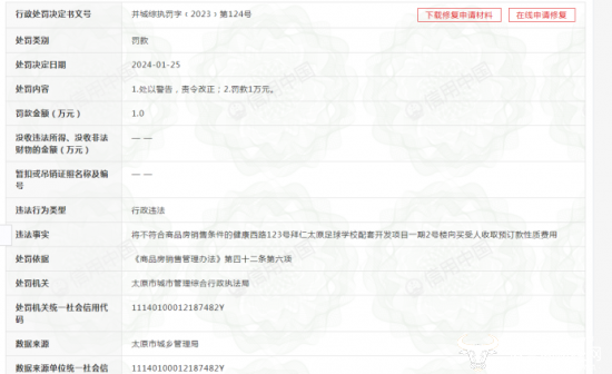 无独有偶,1月15日,根据并城综执罚字〔2023〕第124号文件显示,山西中体未来置业有限公司因将不符合商品房销售条件的健康西路123号拜仁太原足球学校配套开发项目一期2号楼向买受人收取预订款性质费用,被太原市城市管理综合行政执法局罚款1万元。