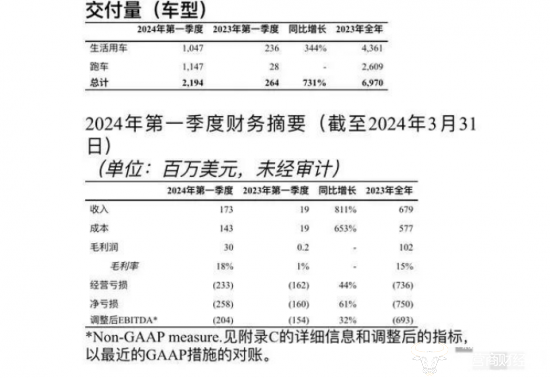 财报显示,路特斯2024年一季度累计销量为2194辆,同比增长731%,实现营业收入1.73亿美元,同比增长811%,毛利率达18%,净亏损2.58亿美元。