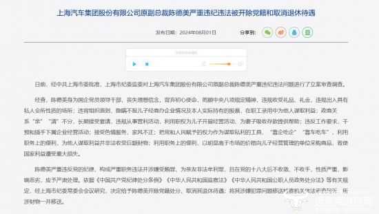 近日,上海市纪委监委网站消息称,上海汽车集团股份有限公司原副总裁陈德美涉嫌严重违纪违法被开除党籍和取消退休待遇,该消息引起人们的关注。