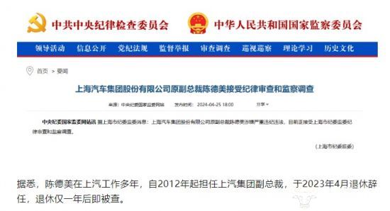 据悉,2024年4月25日,上海市纪委监委网站曾发布消息称,上海汽车集团股份有限公司原副总裁陈德美涉嫌严重违纪违法正接受调查。