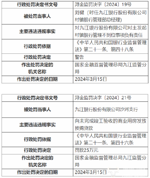 同时,浔金监罚决字〔2024〕21号显示,九江银行沙河支行因向未完成竣工验收的商业用房发放按揭贷款,被国家金融监督管理总局九江监管分局罚款25万元。