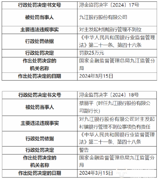 然而,值得关注的是,7月26日,国家金融监督管理总局九江监管分局行政处罚信息公开表显示,九江银行因对主发起村镇银行管理不到位,被罚款25万元;蔡丽平时任九江银行副行长,对上述事项负有责任,被监管警告;刘健时任九江银行村镇银行管理部总经理,对上述事项负有责任,被监管警告。