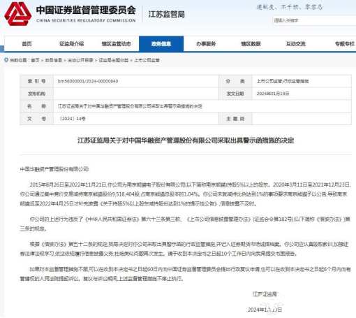 然而,值得一提的是,2024年1月19日,江苏证监局发布了《关于对中国华融资产管理股份有限公司采取出具警示函措施的决定》,被警示的主要原因是信息披露不及时。