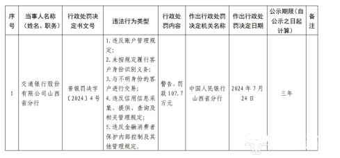 2024年7月29日,中国人民银行山西分行发布的处罚公告显示,交行山西省分行因违反账户管理规定;未按规定履行客户身份识别义务;与不明身份的客户进行交易;违反信用信息采集、提供、查询及相关管理规定;违反金融消费者保护内部控制及其他管理规定,被罚款107.7万元。
