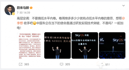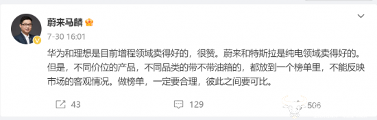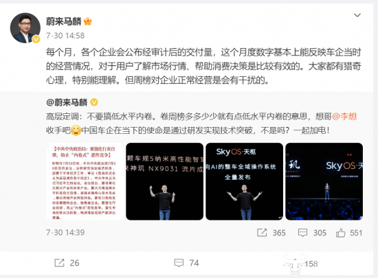 7月30日,蔚来汽车公关总监马麟在个人社媒平台连发三条博文表示:不要搞低水平内卷。卷周榜多多少少就有点低水平内卷的意思;周榜对企业正常经营是会有干扰的;不同价位的产品,不同品类的带不带油箱的,都放到一个榜单里,不能反映市场的客观情况。