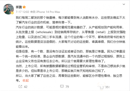 7月17日,理想汽车产品线负责人张骁发文表示“汽车行业的每一个环节都有政府背书的官方统计,这些数据是没法造假的。”此外,张骁还表示,行业的订单量是没有办法证实或者证伪的,因为订单量是企业内部数据,是汽车流通中的一个内部过程指标,需要大家理性看待”