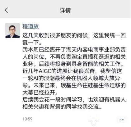 近期,淘天集团迎来人事变动,有消息称原淘宝直播及内容电商事业部负责人程道放被调离岗位,后续转投具身智能相关工作。
