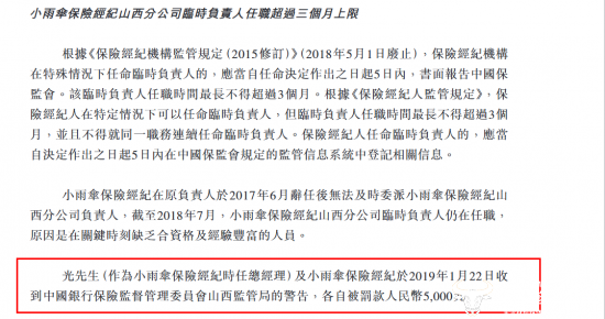 此外,光耀还在2019年1月因小雨伞保险经纪山西分公司时任负责人任职超过三个月上限而被罚5000元。