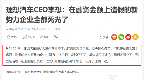 2023年9 月 16 日,理想汽车创始人李想曾在社交平台回复网友评论称,过去这么多年,但凡在融资金额上虚报、造假的造车新势力企业,至今一个不剩,全都死光了。某些借尸还魂的,最后还是个死。那些配合着一起造假的投资方,过去几年也普遍业绩非常差,因为价值观一致。 有网友评论,李想此番话可能暗指威马汽车。