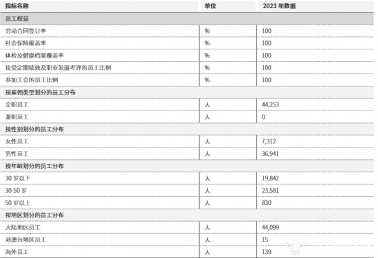 按性别来看,公司男性员工有36941人,占比约83.48%;女性员工有7312人,占比约16.52%。