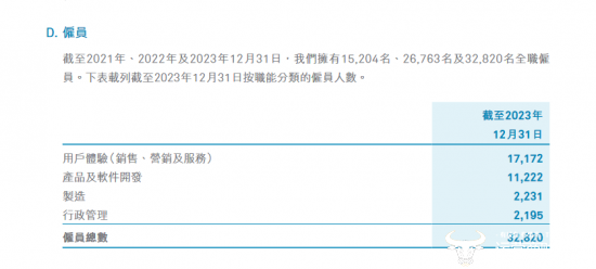 据了解,2023年蔚来共有员工32820人。其中用户体验(销售、营销及服务)员工数最多,为17172人,占比约52.32%;产品及软件开发员工数排在第二位,为11222人,占比约34.19%;负责制造的员工有2231人;负责行政管理的员工有2195人。