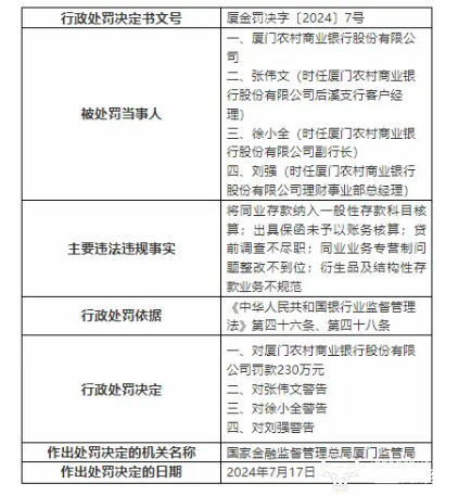此次被处罚,是由于厦门农商银行存在将同业存款纳入一般性存款科目核算、出具保函未予以账务核算、贷前调查不尽职、同业业务专营制问题整改不到位、衍生品及结构性存款业务不规范等违规行为,最终被处以罚款230万元。