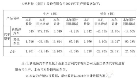 力帆科技7月产销数据显示,该月汽车销量4218辆,同比下降22.85%;其中新能源汽车销量2142辆,同比下降40.13%;今年前7个月,力帆科技累计销量28181辆,同比增长25.53%。
