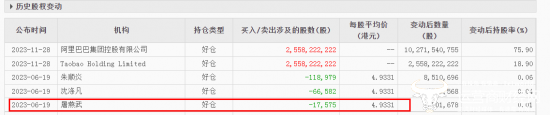 值得一提的是,屠燕武曾在去年6月19日以每股均价4.9331港元的价格出售阿里健康约1.76万股普通股股份,套现约8.67万港元,相当于人民币8万元。
