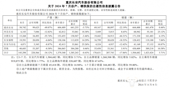 最新数据显示,长安汽车7月销量17.06万辆,同比下滑17.86%;其中自主品牌新能源销量4.54万辆,同比增长14.94%。