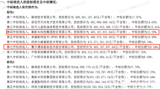 值得一提的是,赛尔通信此次也参与了投标,但收获不算大,拿下标包1中第七中标份额,即8.54%。有意思的是,在同一标包中位列第四中标候选人的高新兴科技集团股份有限公司与赛尔通信给出了相同报价,都是493167837.64元(不含税),这种情况还是比较少见的。