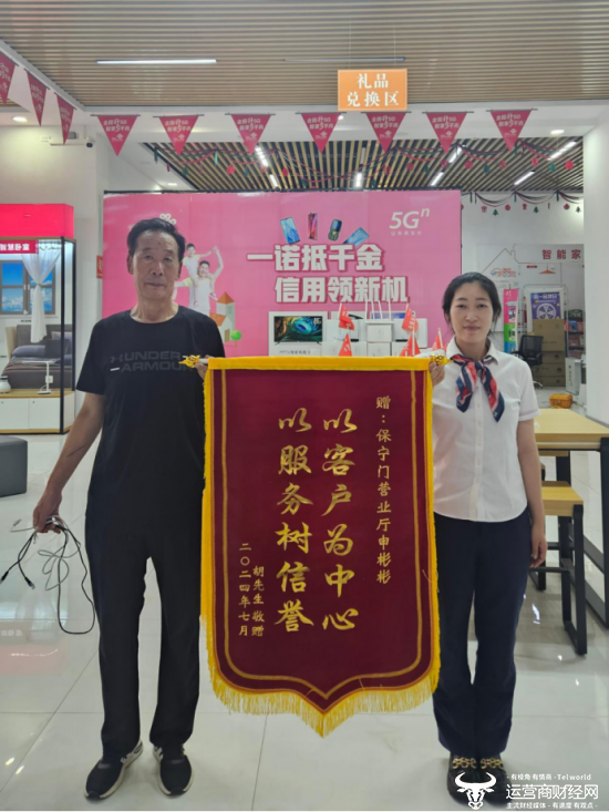 坚守温情服务,做客户解忧的“暖心人”。彬彬是位热情大方、善解人意的好姑娘,在每次办理完业务后总是会主动询问客户还有什么需求,力所能及的去帮助和关爱客户,得到了客户的认可和赞扬。近日,客户胡先生亲自到营业厅为彬彬送来了锦旗,表达对彬彬优质服务的感谢。