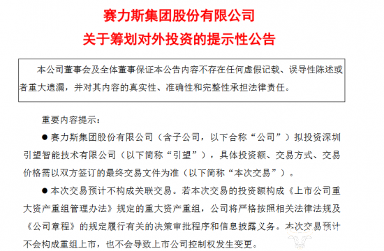 7月29日,公司又发布《关于筹划对外投资的提示性公告》表示:赛力斯集团股份有限公司拟投资深圳引望智能技术有限公司。