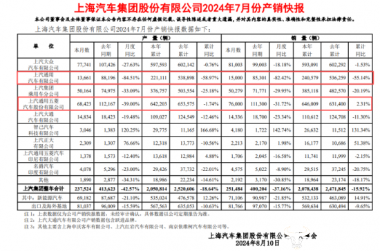 据了解,通用汽车在中国的合作伙伴一共有两个,分别是上汽通用汽车和上汽通用五菱汽车有限公司。上汽集团发布的2024年7月份产销快报显示,该月上汽通用汽车的销量为15000辆,同比暴跌82.42%,而这已经是上汽通用连续第七个月销量下滑了;今年前7个月,上汽通用汽车累计销量240579辆,同比下降55.14%。