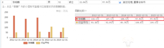 值得一提的是,张晓鹏近几年不断降薪,且降薪幅度较大。从他刚上任副总经理不久的2012年,他的薪酬为218万元,2014年为199万元,到近两年,2022年和2023年,他的薪酬降至57.5万元。10年间,张晓鹏共降薪160.5万元。