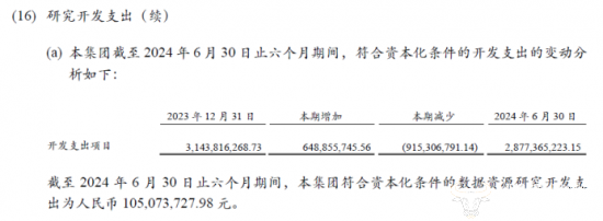 在中期财报核心的三大表之一——合并资产负债表中,可以发现数据资源项目共“入表”1.05亿元,均在开发支出项目中。在开发支出科目明细中,可以看到数据资源本期增加1.05亿元。