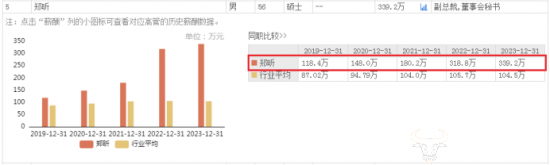 根据东方财富网显示,郑昕近几年的薪酬不断提高,从2019年的118.4万,到2021年的180.2万,再到2023年的339.2万元,四年涨薪220.8万元,薪酬待遇相当不错。