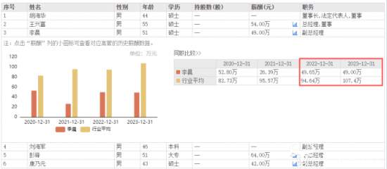 东方财富网显示,李晨去年从公司取得了49.0万元的薪酬,较上一年的49.65万元变化不大,但不如副总彭锋高。彭锋是大专学历,和李晨今年都是51岁,去年的薪酬为64万元。