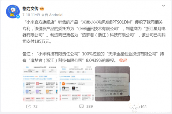 不到两小时,格力发布微博回应,称侵犯专利产品的制造商造梦者科技有限公司已向格力支付185万元。
