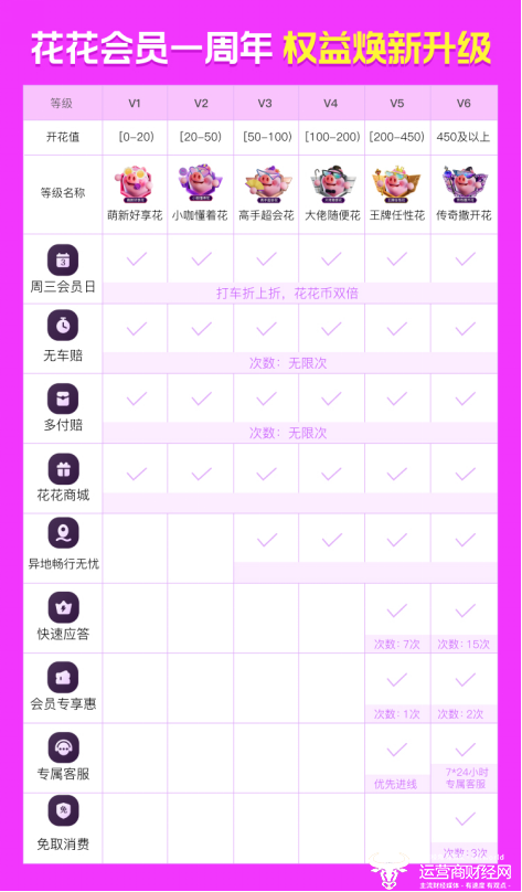 本次花花会员权益升级,在周三会员日折上折、快速应答、多付赔、专属在线客服等原有权益基础上,进一步新增免取消费、无车赔、异地畅行无忧等多项重磅权益,全方位多场景提升用户打车体验。