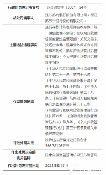 据近日国家金融监督管理总局江苏监管局发布的行政处罚公开表显示,苏商银行(原苏宁银行)因7项违法违规行为被罚没366万余元,看来问题严重。