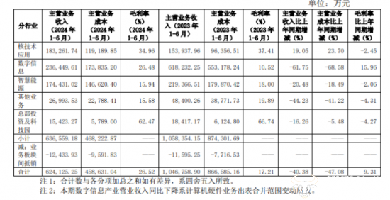 公司在财报中说”剔除计算机硬件业务出表影响,公司核技术应用产业和数字信息产业的营业收入和利润总额均实现增长。”根据财报来看,作为主营业务的数字信息毛利润增加最多,是实现利润总额增加的主要原因。虽然这部分的营业收入下降,但成本下降也较大,下降了68.58%。